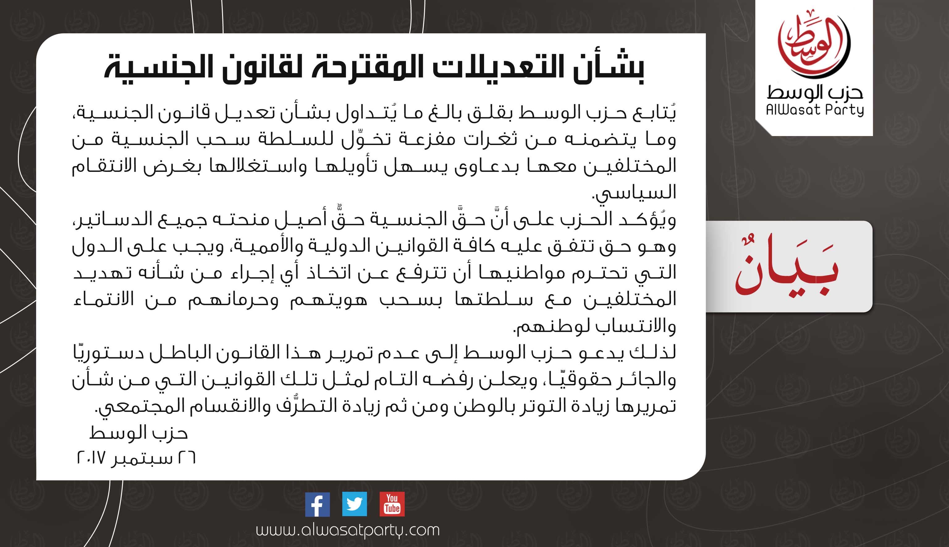 يُتابع حزب الوسط بقلق بالغ ما يُتداول بشأن تعديل قانون الجنسية، وما يتضمنه من ثغرات مفزعة تخوِّل للسلطة سحب الجنسية من المختلفين معها بدعاوى يسهل تأويلها واستغلالها بغرض الانتقام السياسي.