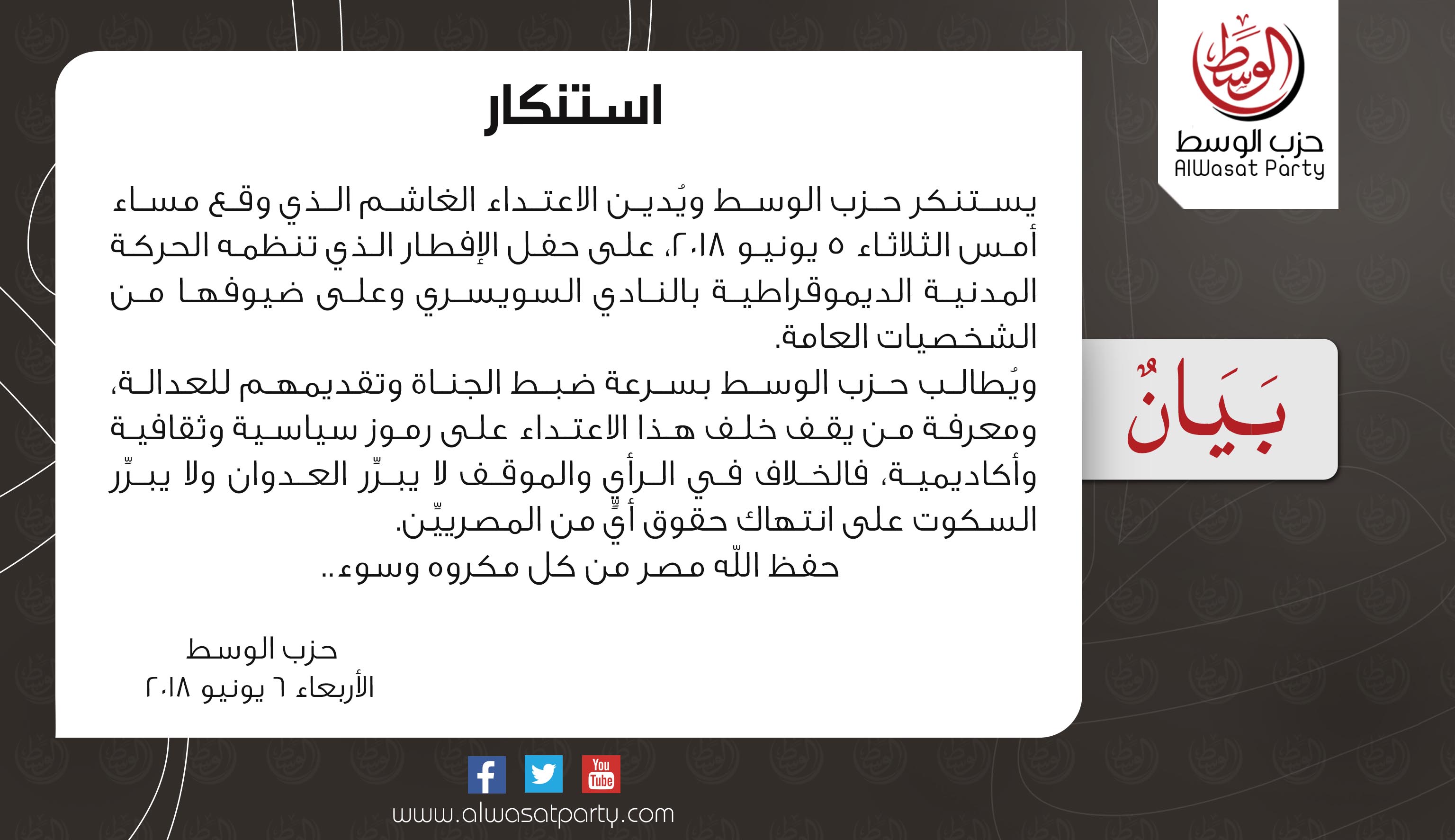 يستنكر حزب الوسط ويُدين الاعتداء الغاشم الذي وقع مساء أمس الثلاثاء 5 يونيو 2018، على حفل الإفطار الذي تنظمه الحركة المدنية الديموقراطية بالنادي السويسري وعلى ضيوفها من الشخصيات العامة.
